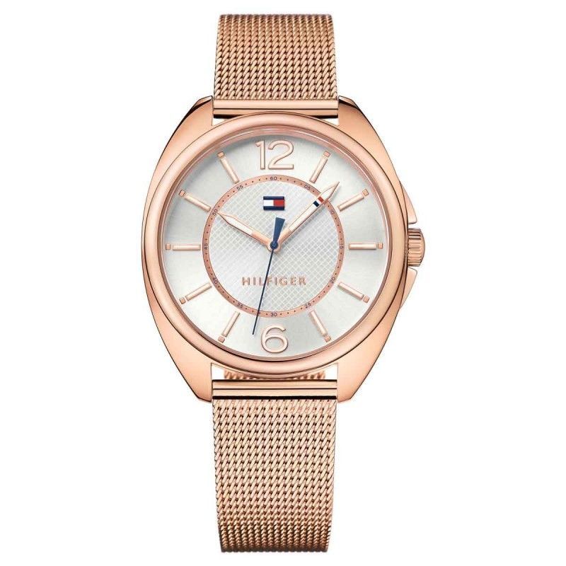Reloj Tommy Hilfiger para dama vintage, caja de acero oro rosa, carátula plata con detalles oro rosa, extensible de acero oro rosa mesh, cristal mineral.