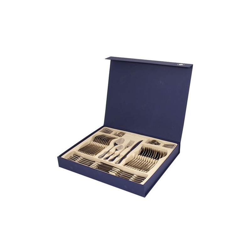Cubierto fabricado en Acero Inoxidable, extra pulido espejo, presentado en caja individual, estuche azul de bandeja crema y cierre iman.