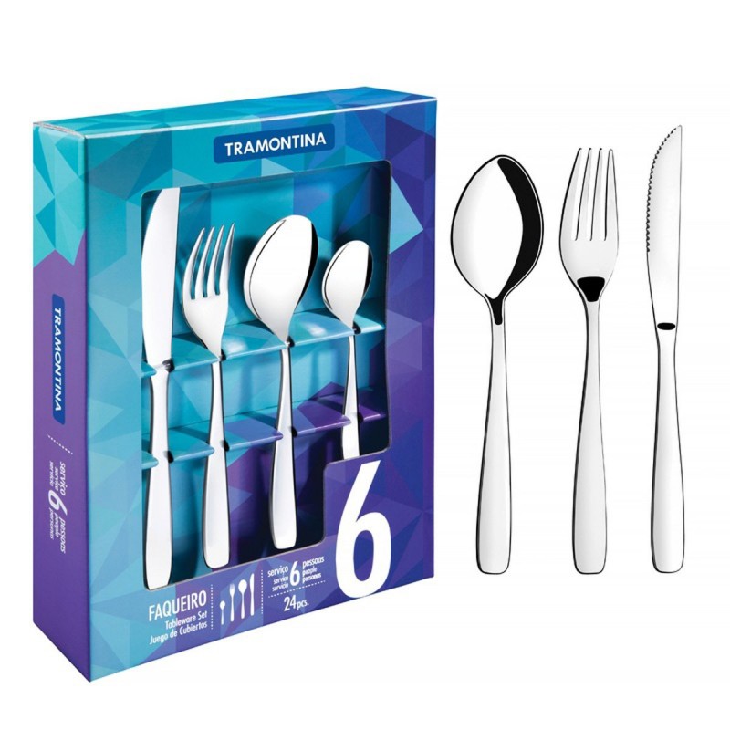 JUEGO DE CUBIERTOS AMAZONAS 24PZ. CUBIERTOS DE ACERO INOXIDABLE. CONTIENE: 6 CUCHILLOS DE ASADO, 6 TENEDORES DE MESA, 6 CUCHARAS DE MESA Y 6 CUCHARAS PARA CAFÉ.. Dimensiones: ALTO 6, FRENTE 29, FONDO 20.5. PESO:0.95