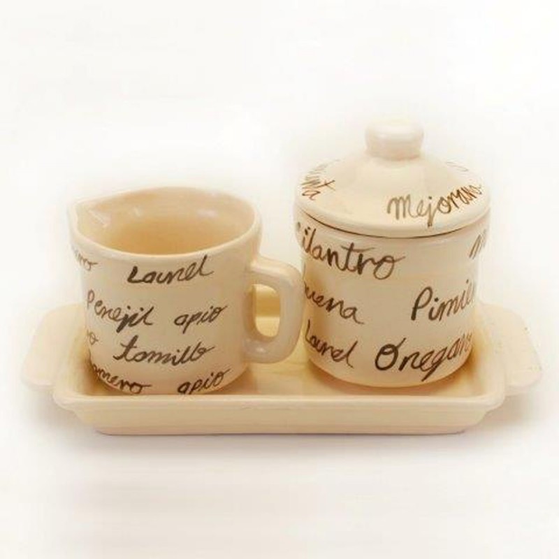 JUEGO DE AZUCARERA, CREMERA Y CHAROLA DE CERAMICA DECORADO LETRAS