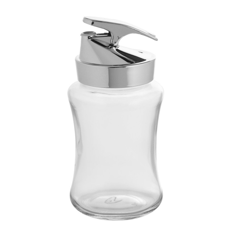 MIELERA DE VIDRIO CON TAPA CROMADA. Dimensiones: ALTO 13 CM, FRENTE 7 CM , FONDO 7 CM. PESO EN GRAMOS: 225 GRAMOS