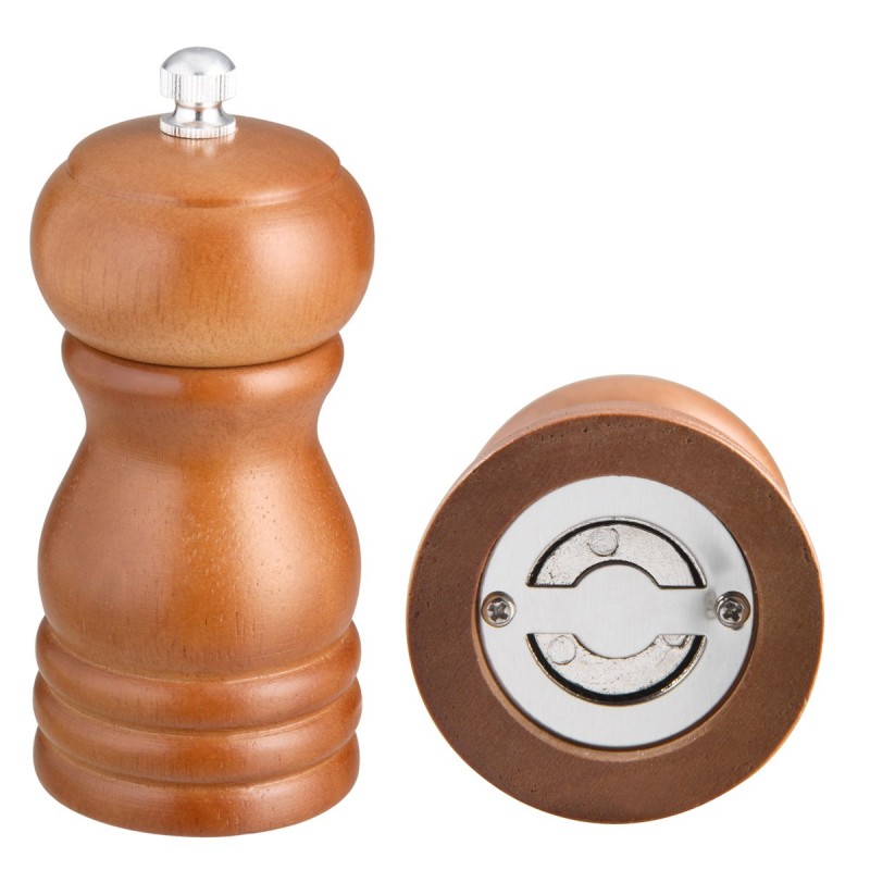 Molino de madera para Sal y Pimienta 11 cm de altura, su mecanismo es de Acero inoxidable para una larga duración.. Dimensiones: Alto 12 CM cm, Frente 5.5 CM cms, Fondo 5.5 CM cms. Peso en gramos: 160 GR