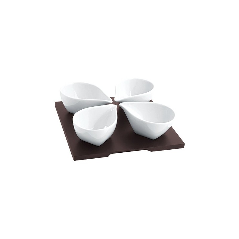 JUEGO DE 4 SALSERAS DE PORCELANA BLANCA DE 14 CM X 9.4 CM X 5.8 CM Y 1 BASE DE MADERA COLOR CHOCOLATE DE 25.7 CM X 25.75 CM 1.2 CM