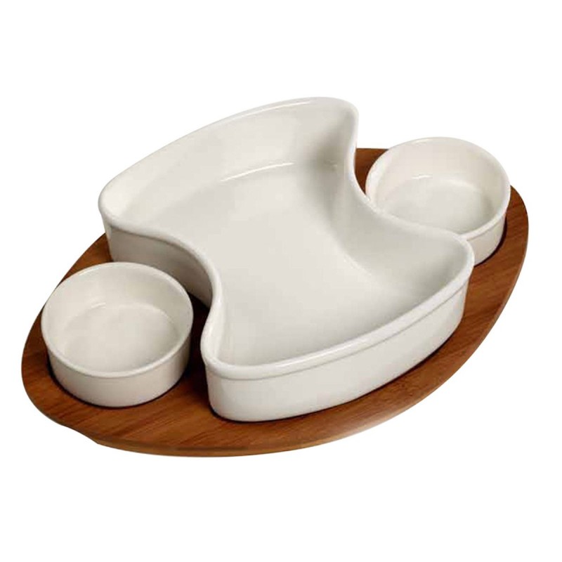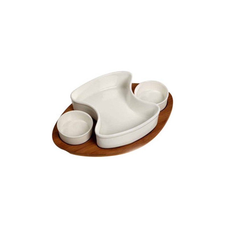 Juego de ensalada 4 piezas. Cuenta con dos recipientes para dip, uno más grande para ensalada y una base de madera con goma antiderrapante.. Dimensiones: Alto 8 CM, Ancho 24.3 CM, Fondo: 36.2 CM