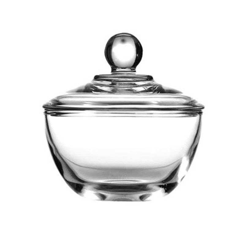 Azucarera con tapa en vidrio cristalino con capacidad de 240 ml, artículo ideal para el servicio de mesa. Excelente porque no guarda olores y sabores.. Dimensiones: Alto 11 CM cm, Frente 10.5 CM cms, Fondo 10.5 CM cms. Peso en gramos: 368 GR