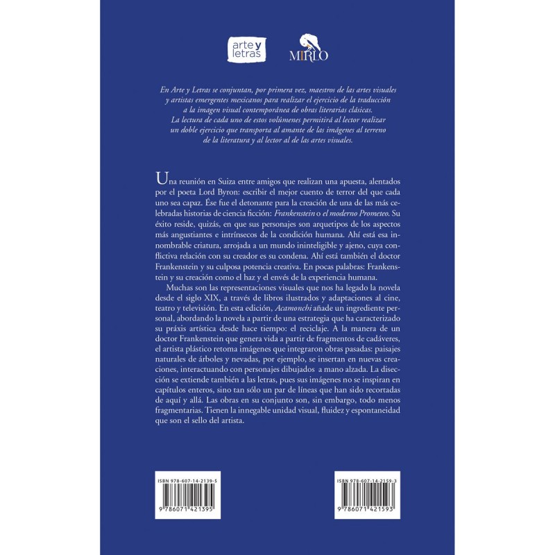 En Arte y Letras se conjuntan, por primera vez, maestros de las artes visuales y artistas emergentes mexicanos para realizar el ejercicio de la traduccion a la imagen visual contemporanea de obras literarias clasicas. La lectura de cada uno de estos volumenes permitira al lector realizar un doble ejercicio que transporta al amante de las imagenes al terreno de la literatura y al lector al de las artes visuales. Una reunion en Suiza entre amigos que realizan una apuesta, alentados por el poeta Lord Byron: escribir el mejor cuento de terror del que cada uno sea capaz. Ese fue el detonante para la creacion de una de las mas celebradas historias de ciencia ficcion: Frankenstein o el moderno Prometeo. Su exito reside, quizas, en que sus personajes son arquetipos de los aspectos mas angustiantes e intrinsecos de la condicion humana. Ahi esta esa innombrable criatura, arrojada a un mundo ininteligible y ajeno, cuya conflictiva relacion con su creador es su condena. Ahi esta tambien el doctor Frankenstein y su culposa potencia creativa. En pocas palabras: Frankenstein y su creacion como el haz y el en ves de la experiencia humana. Muchas son las representaciones visuales que nos ha legado la novela desde el siglo XIX, a traves de libros ilustrados y adaptaciones al cine, teatro y television. En esta edicion, Acamonchi añade un ingrediente personal, abordando la novela a partir de una estrategia que ha caracterizado su praxis artistica desde hace tiempo: el reciclaje. A la manera de un doctor Frankenstein que genera vida a partir de fragmentos de cadaveres, el artista plastico retoma imagenes que integraron obras pasadas: paisajes naturales de arboles y nevadas, por ejemplo, se insertan en nuevas creaciones, interactuando con personajes dibujados a mano alzada. La diseccion se extiende tambien a las letras, pues sus imagenes no se inspiran en capitulos enteros, sino tan solo un par de lineas que han sido recortadas de aqui y alla. Las obras en su conjunto son, sin embargo, todo menos fragmentarias. Tienen la innegable unidad visual, fluidez y espontaneidad que son el sello del artista.