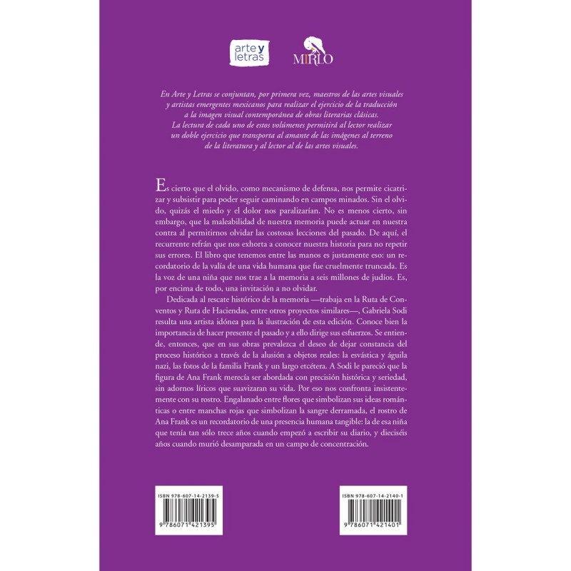 En Artey Letras se conjuntan, por primera vez, maestros de las artes visuales y artistas emergentes mexicanos para realizar el ejercicio de la traduccion a la imagen visual contemporanea de obras literarias clasicas. La lectura de cada uno de estos volumenes permitira al lector realizar un doble ejercicio que transporta al amante de las imagenes al terreno de la literatura y al lector al de las artes visuales. Es cierto que el olvido, como mecanismo de defensa, nos permite cicatrizar y subsistir para poder seguir caminando en campos minados. Sin el olvido, quizas el miedo y el dolor nos paralizarian. No es menos cierto, sin embargo, que la maleabilidad de nuestra memoria puede actuar en nuestra contra al permitirnos olvidar las costosas lecciones del pasado. De aqui, el recurrente refran que nos exhorta a conocer nuestra historia para no repetir sus errores. El libro que tenemos entre las manos es justamente eso: un recordatorio de la valia de una vida humana que fue cruelmente truncada. Es la voz de una niña que nos trae a la memoria a seis millones de judios. Es, por encima de todo, una invitacion a no olvidar. Dedicada al rescate historico de la memoria —trabaja en la Ruta de Conventos y Ruta de Haciendas, entre otros proyectos similares—, Gabriela Sodi resulta una artista idonea para la ilustracion de esta edicion. Conoce bien la importancia de hacer presente el pasado y a ello dirige sus esfuerzos. Se entiende, entonces, que en sus obras prevalezca el deseo de dejar constancia del proceso historico a traves de la alusion a objetos reales: la esvastica y aguila nazi, las fotos de la familia Frank y un largo etcetera. A Sodi le parecio que la iigura de Ana Frank merecia ser abordada con precision historica y seriedad, sin adornos liricos que suavizaran su vida. Por eso nos confronta insistentemente con su rostro. Engalanado entre flores que simbolizan sus ideas romanticas o entre manchas rojas que simbolizan la sangre derramada, el rostro de Ana Frank es un recordatorio de una presencia humana tangible: la de esa niña que tenia tan solo trece años cuando empezo a escribir su diario, y dieciseis años cuando murio desamparada en un campo de concentracion.