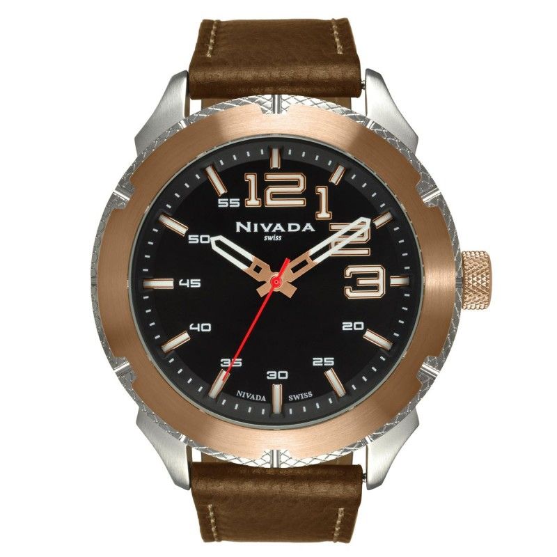 Reloj nivada para caballero, caratula color negra lisa, numeros arabigos e indicadores blancos, caja de acero, correa de piel color negro con hebilla, bisel color oro rosado, cristal de mineral, analogo, hermeticidad 3 atm, estilo deportivo, maquina de cuarzo, caja redonda.