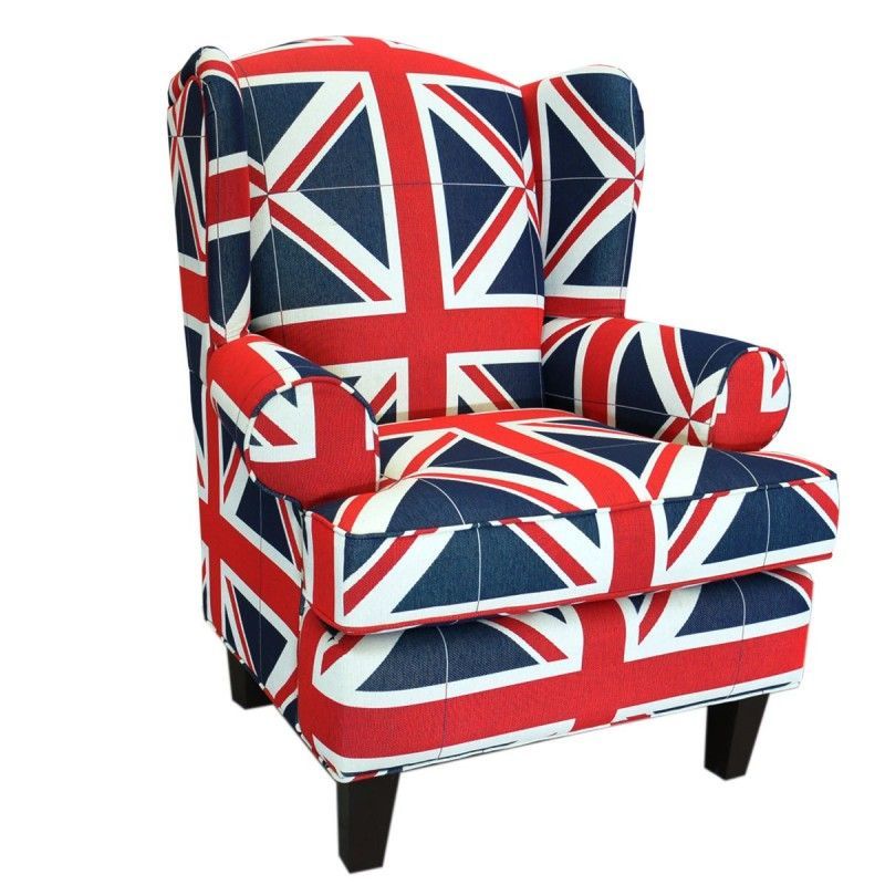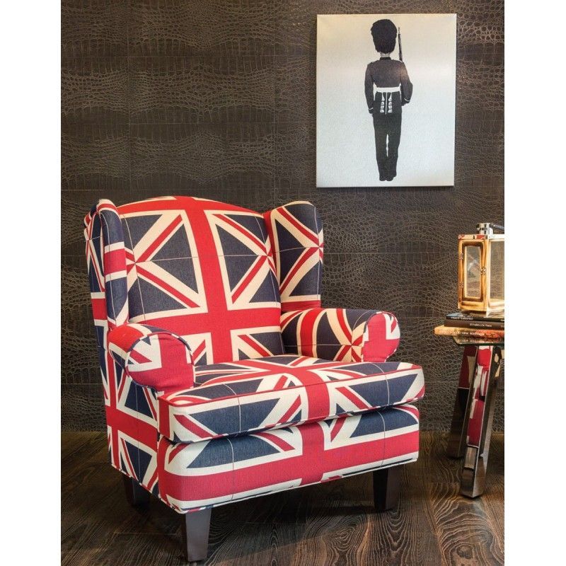 SILLON DE TIPO CLÁSICO, TAPIZADO EN TELA CON IMPRESIÓN DE LA BANDERA DE INGLATERRA.