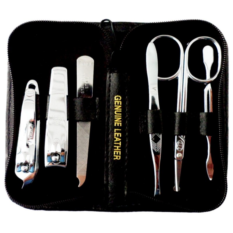 Estuche de manicure en piel con 6 pzas en color plata hechas en acero inoxidable y aleacion de acero al carbon.